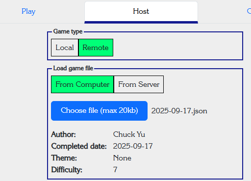 {"Author": "Chuck Yu","Completed date": "2025-09-17","Theme": "None","Difficulty": "7",}When the file is first opened, before the host clicks the "create game" button, the metadata will be displayed beneath the file chooser.